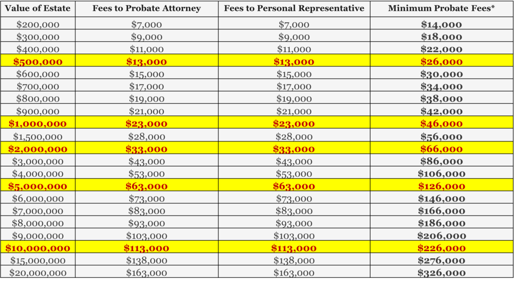 The cost of probate is set by state law. When all the costs are added up – these may include appraisal costs, executor's fees, court filing fees and certified copies, costs for a type of insurance policy known as a "surety bond," plus legal and accounting fees--probate can cost from 4% to 7% of the total estate value, sometimes more. If someone contests the Will, there could be thousands of dollars of litigation costs.